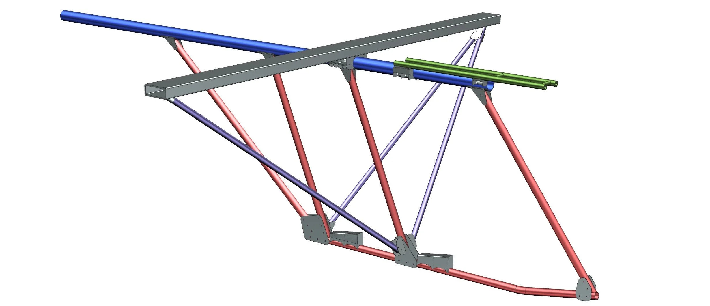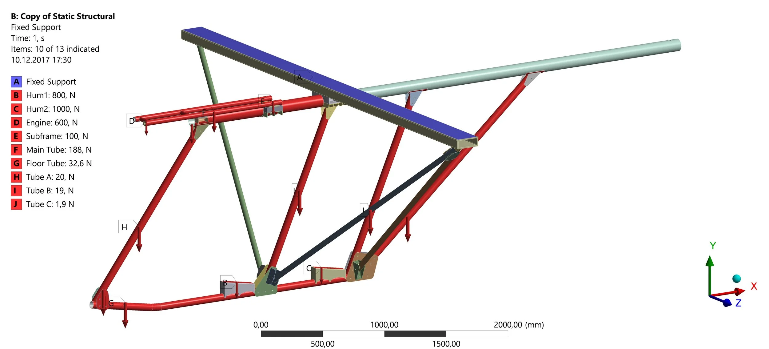 For the finite element analysis (FEA), we measured all the components' actual thickness and mass. Additionally, the disassembly and study of the flying prototype showed no sign of fatigue cracks, bent cross sections or stretched bolts. Using NX and Ansys WB Mechanical, I created a mid-surface shell model for all the airframe members. To simulate the correct stress distribution, I added the point masses representing the engine (60kg), two pilots (80kg and 100kg), and the distributed force representing the weight of the members.